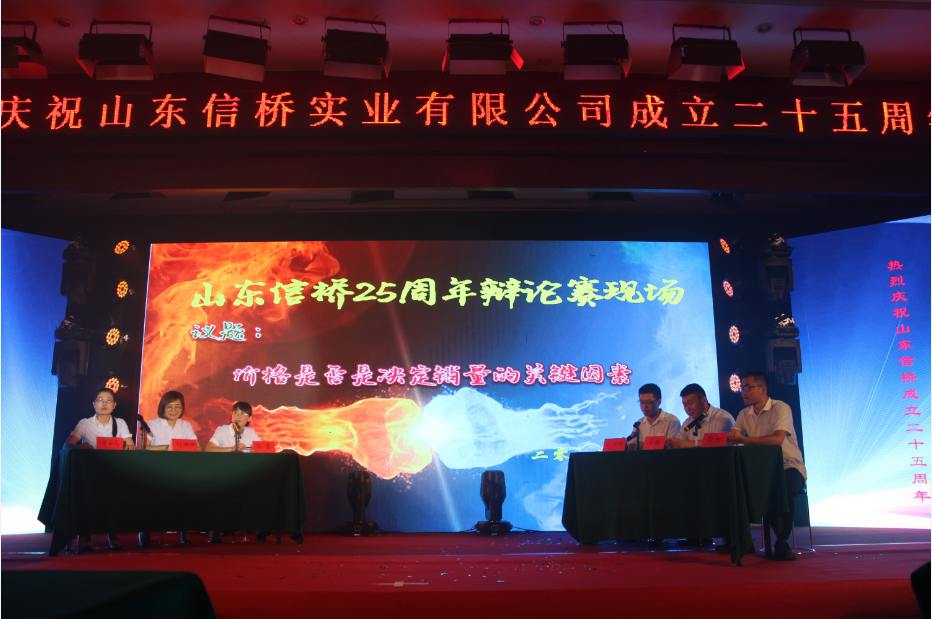 第五個(gè)節(jié)目是由信橋男生隊(duì)王丙丙、高雨、郭帥,女生隊(duì)徐賽、劉琳琳、宋金萍,客串周廣超、趙文玲帶來(lái)的《辯論賽》,辯論主題是價(jià)格是否是決定銷量的關(guān)鍵因素,雙方辯手就自己的觀點(diǎn)展開(kāi)了激烈的討論,最后全體辯手共同朗誦《沁園春·信橋》。